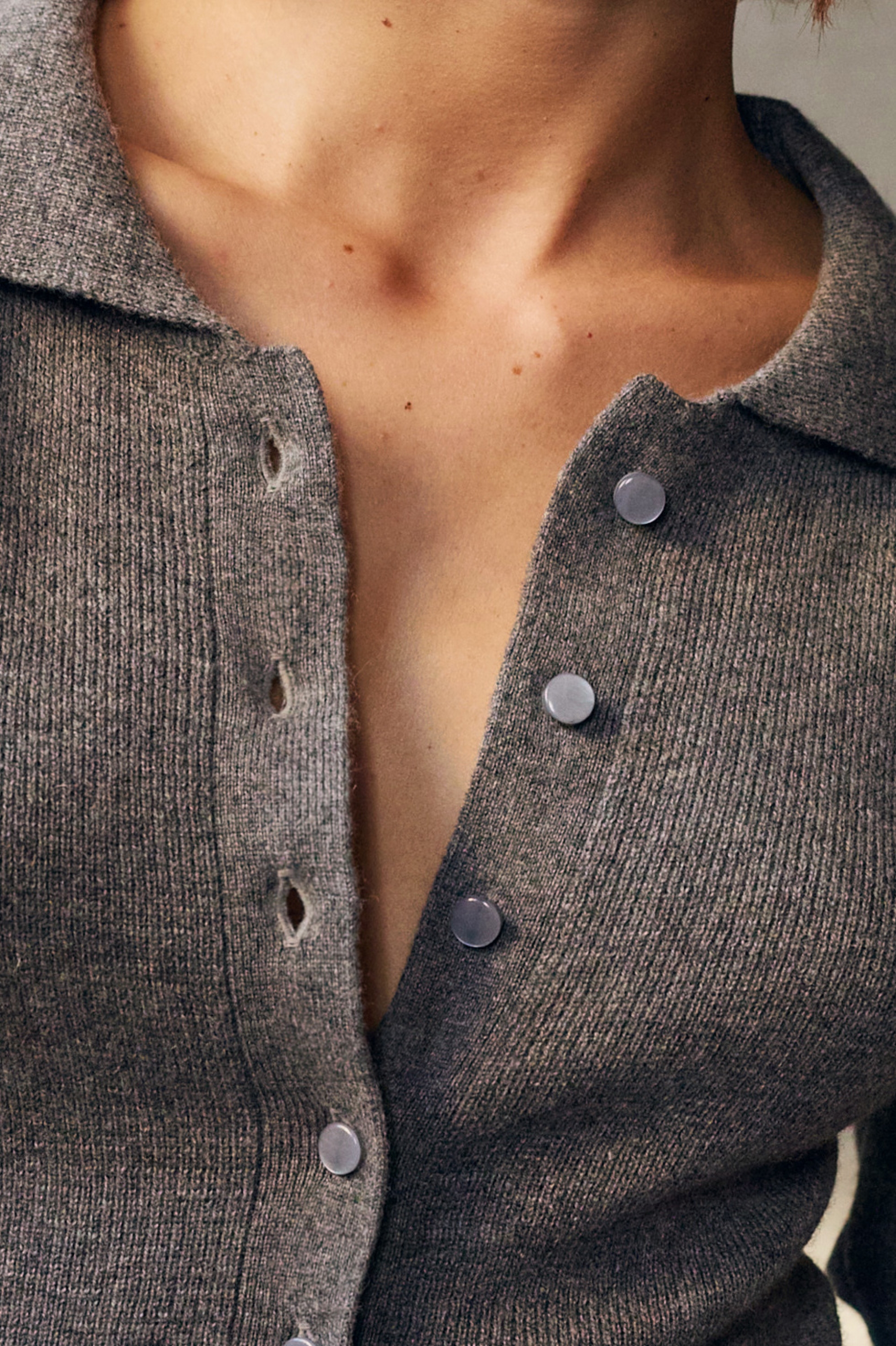 • Details : overhemdkraag, parelmoeren knopen, lange mouwen