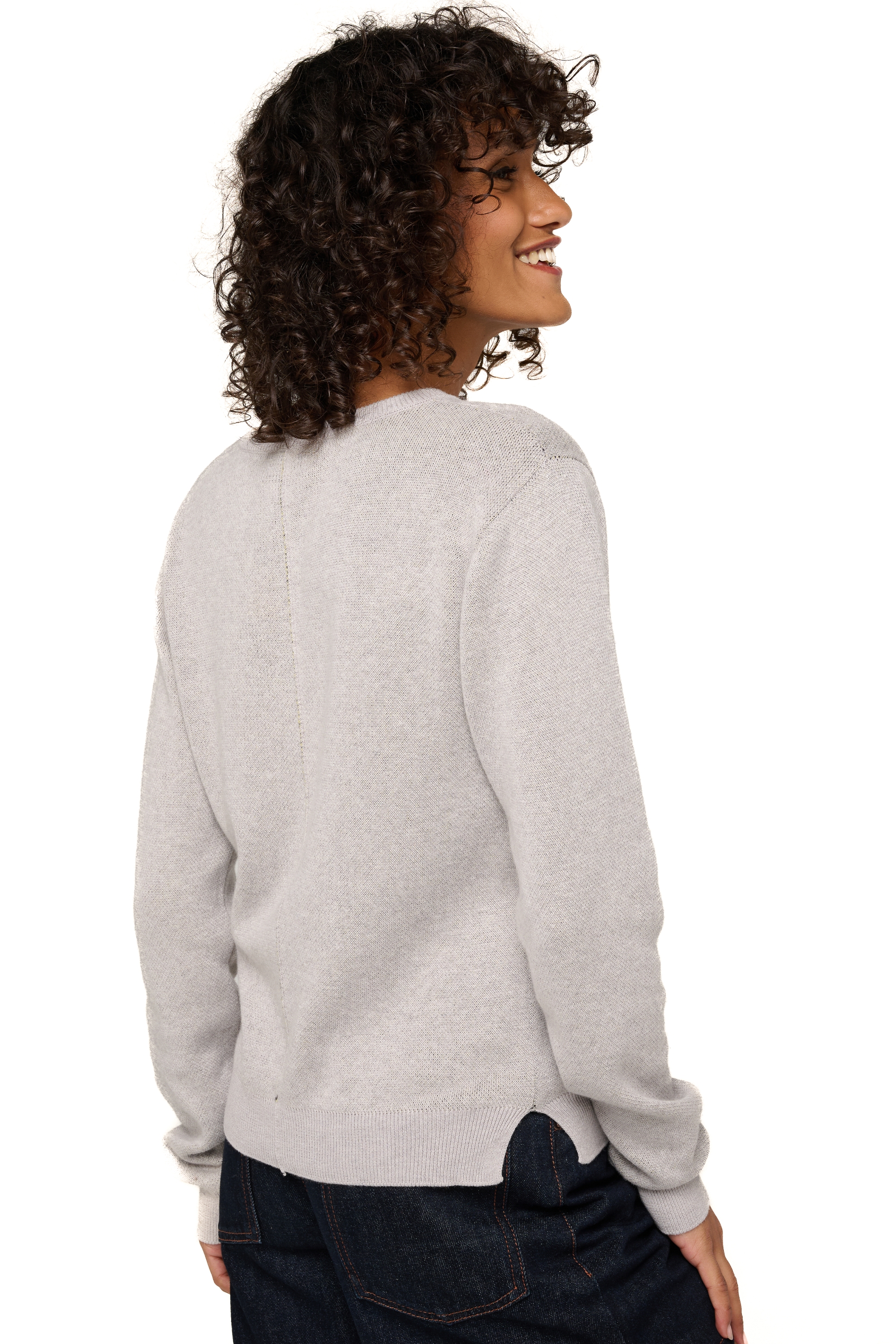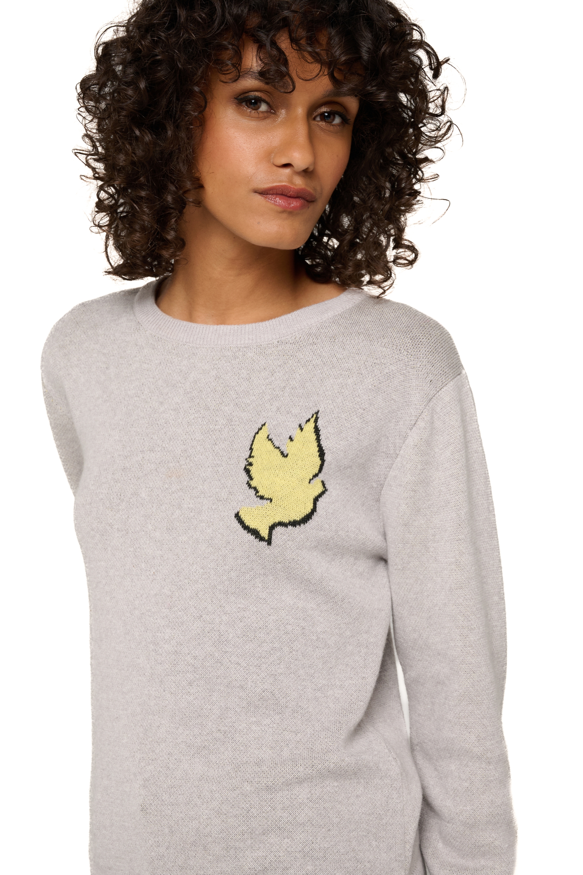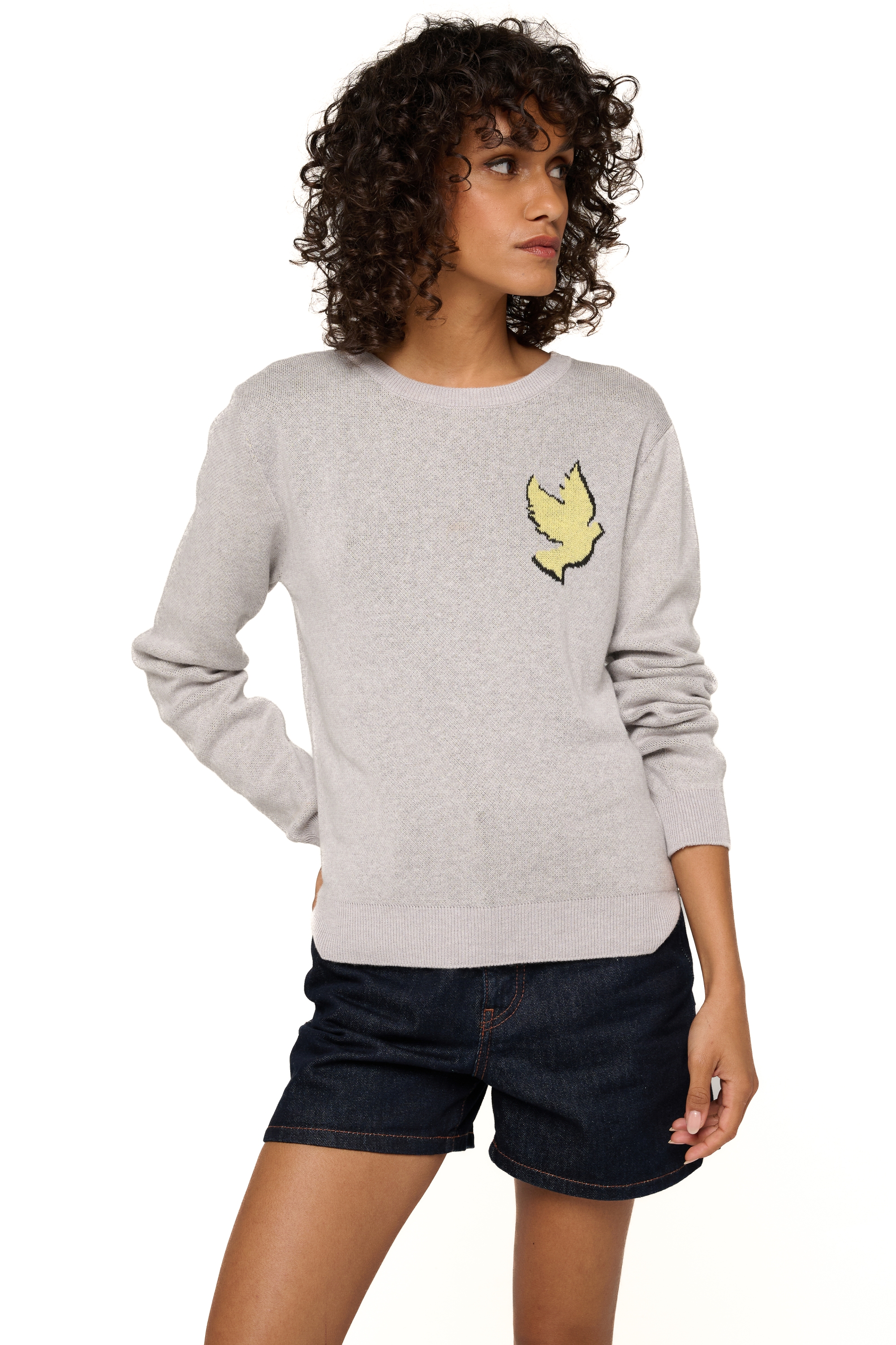 Trui in sweatstijl met ronde hals en tweekleurige duifjacquard. Gebreid in 4-draads katoen-kasjmier, is het een superzacht breisel dat het hele jaar door aangenaam is om te dragen.
