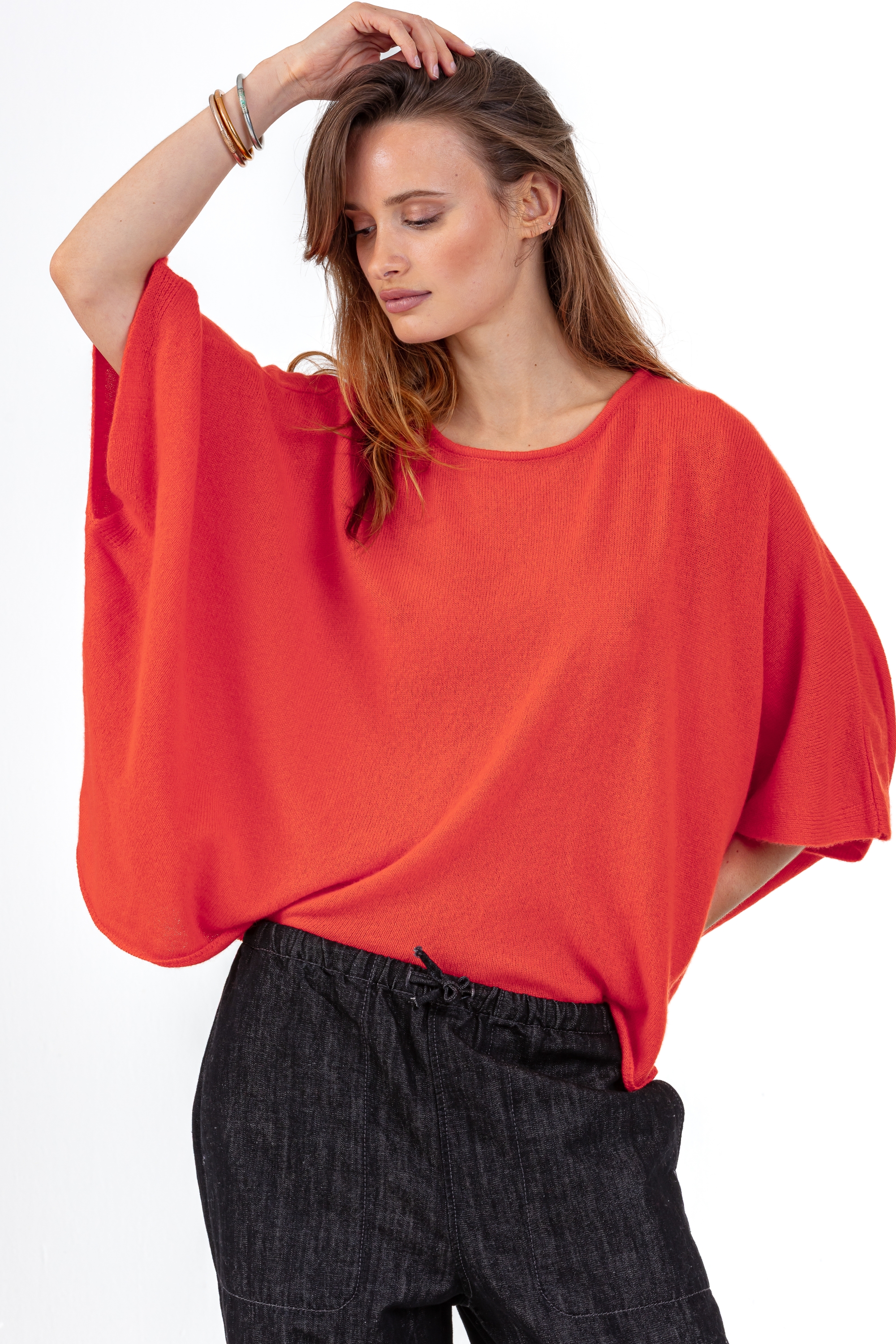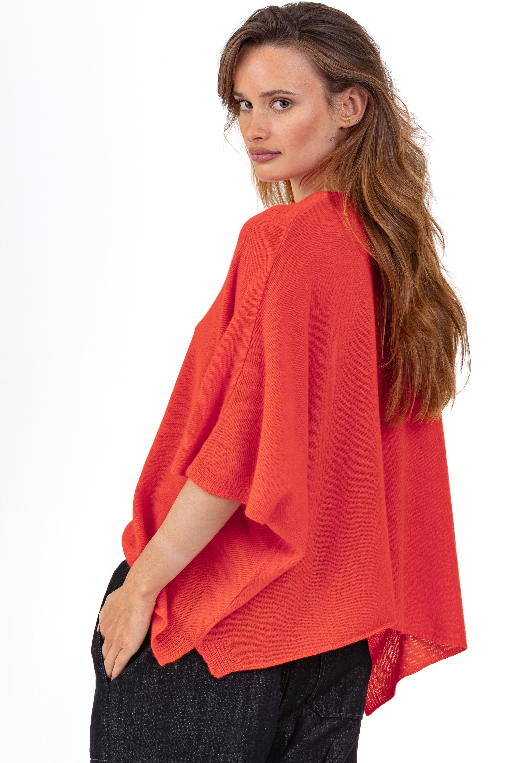 Luchtig en modern, de PYTHAGORE damesponcho biedt een vloeiend, elegant silhouet. Gebreid in 100% 2-draads losse kasjmier, betovert hij met zijn soepele, lichte breisel. Met zijn ronde hals, wijde snit en korte mouwen herinterpreteert hij de traditionele poncho in een chique, eigentijdse versie.