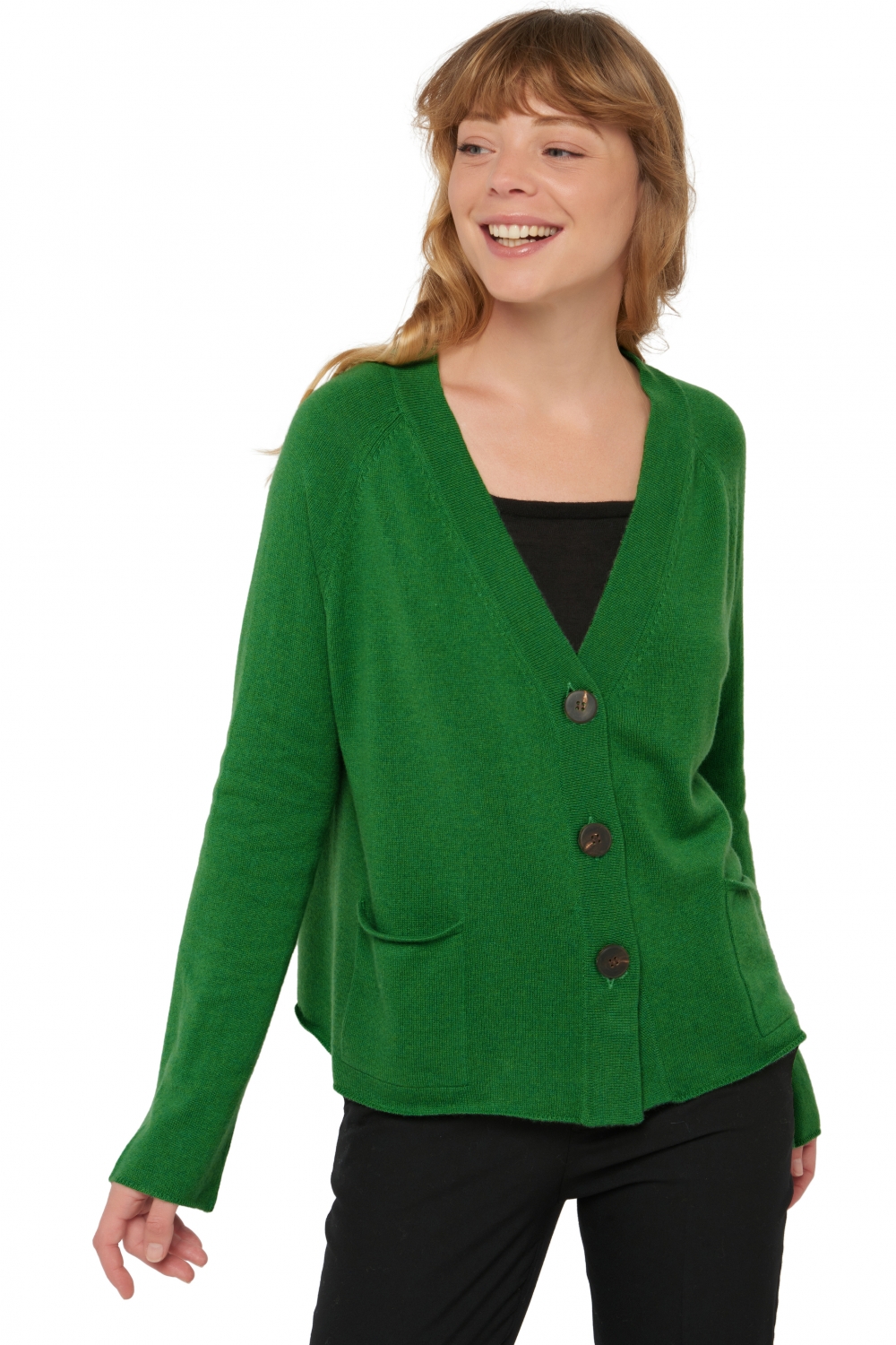 Diepe V-hals met 3 grote houten knopen en voor zakken.