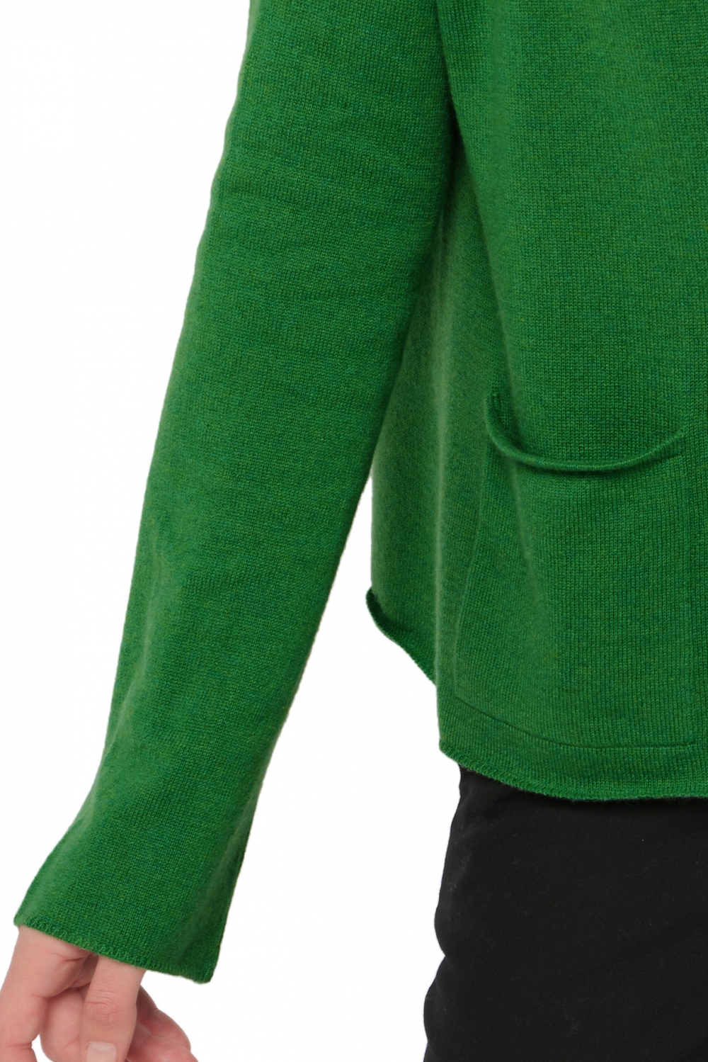 Eenvoudige afwerking aan de manchetten en aan de basis, 1x1 ribboord langs de kraag.