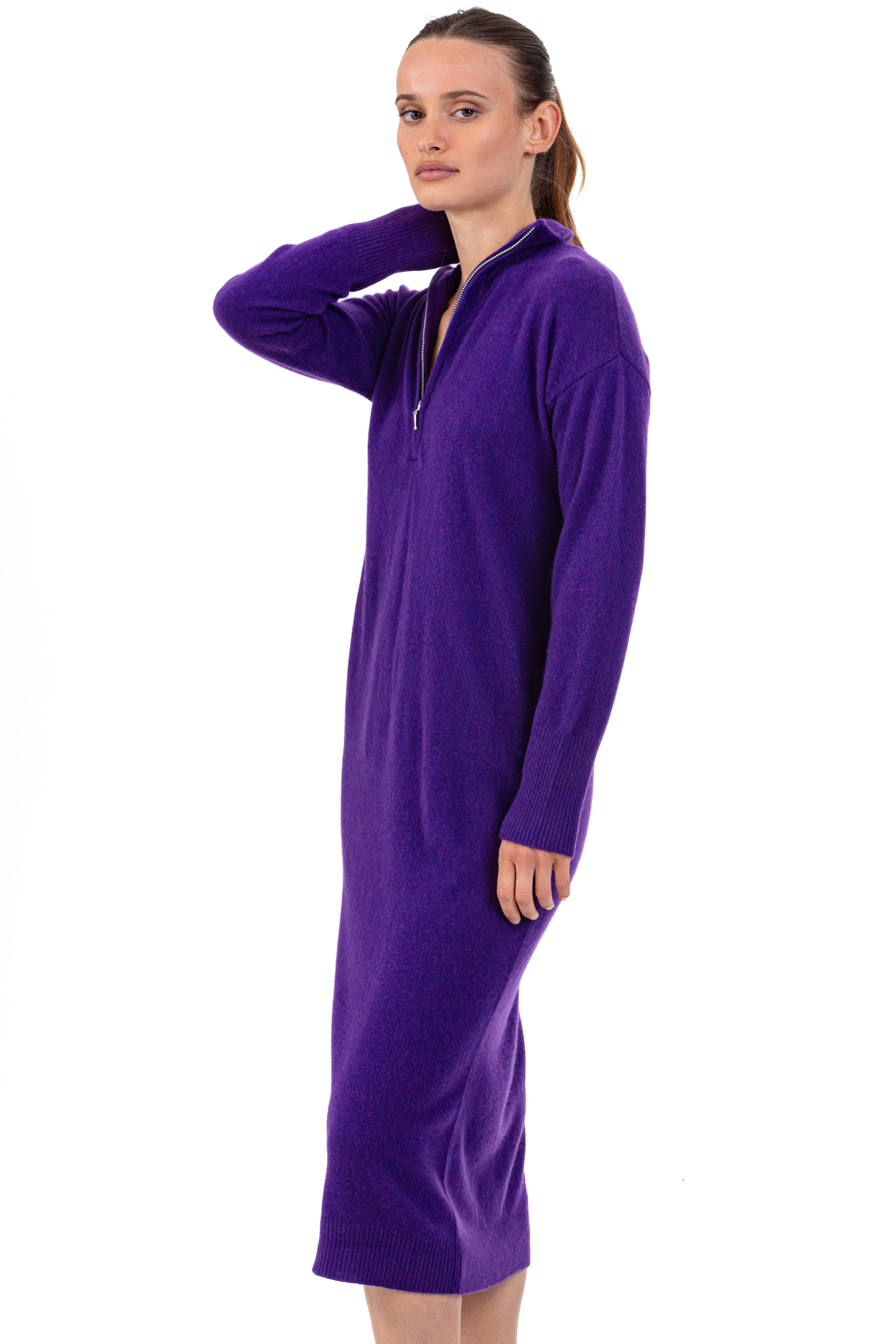 De moderne en gestroomlijnde ROSETTE-jurk heeft een rechte snit en een opvallende polokraag met rits. De jurk is gebreid van 2-draads 100% kasjmier, dikte 12, en biedt superieur comfort terwijl hij het figuur flatteert.