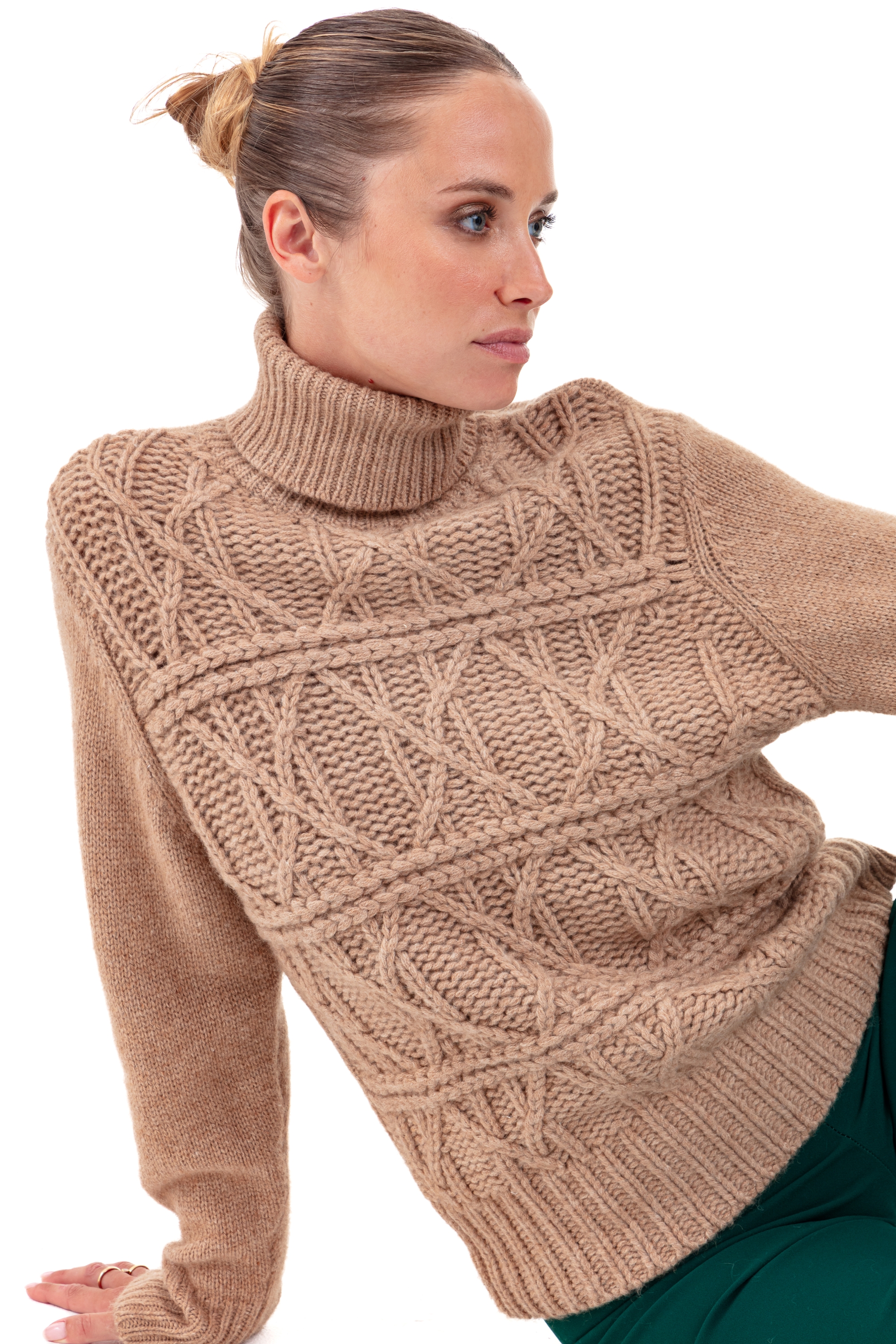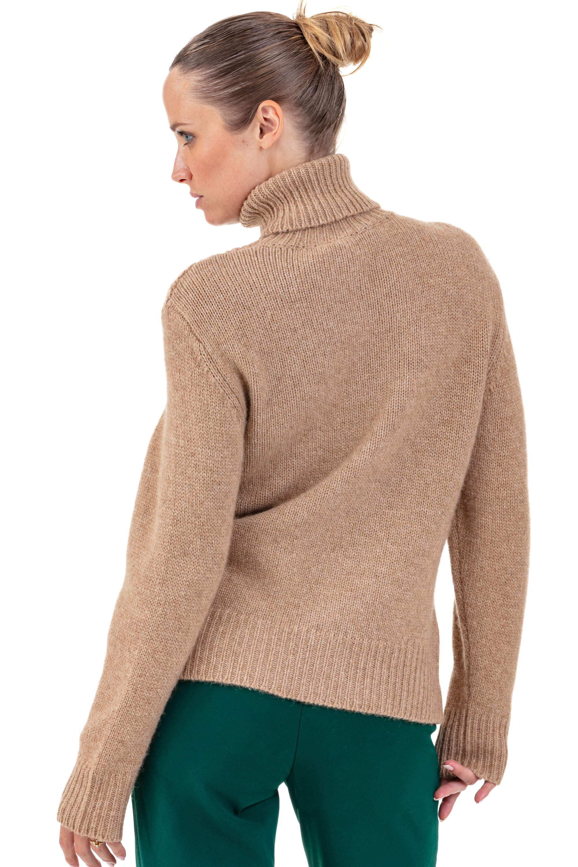 De unieke en gestructureerde POETI damestrui valt op door het grafische design. Gebreid in 100% kamelenhaar, combineert hij een 16-draads kabelbreisel aan de voorkant met een lichter 6-draads breisel aan de achterkant en mouwen. Dit contrast geeft het een gedurfde, architecturale stijl.