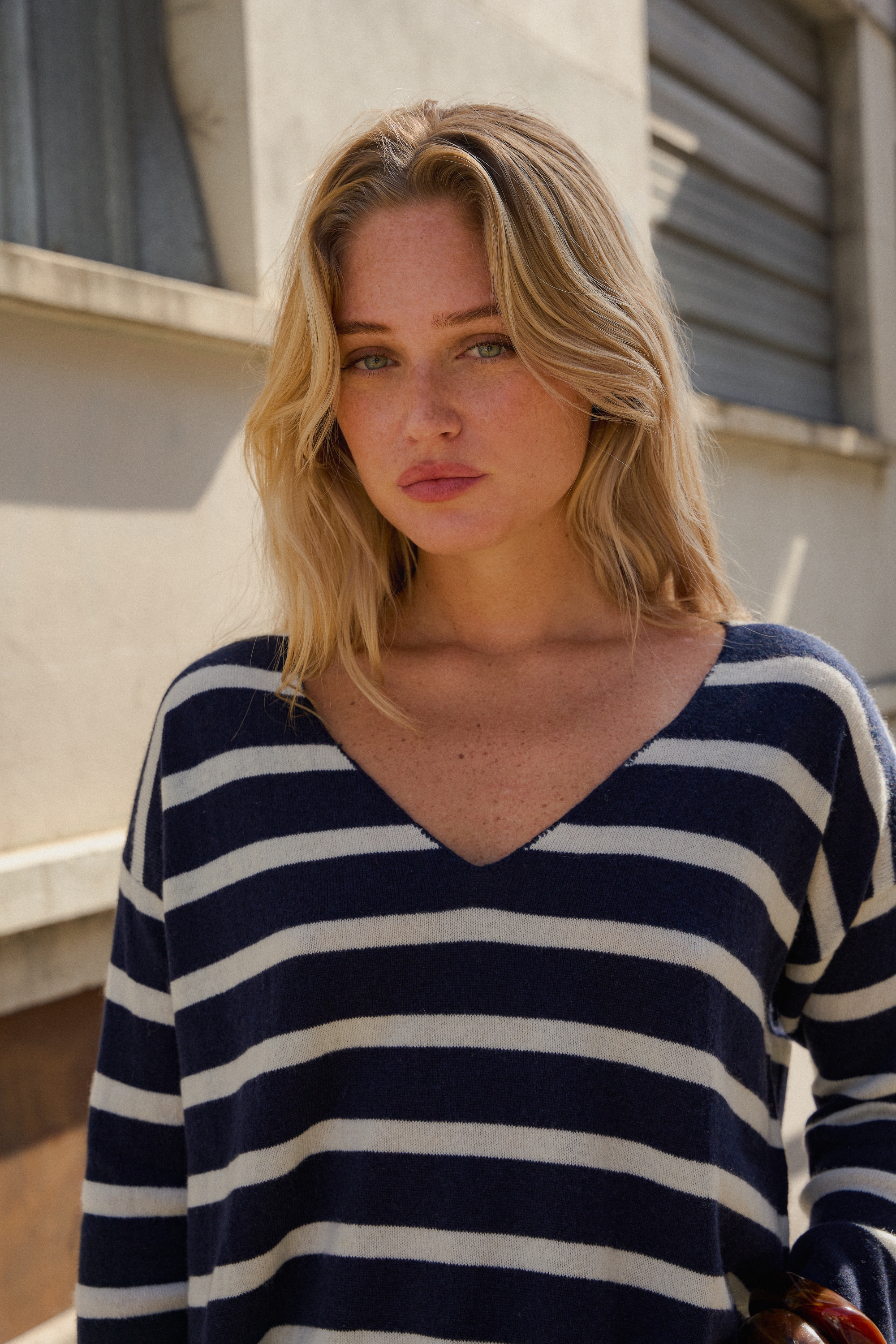 Deze trui brengt de iconische Bretonse streep terug met subtiele, vrouwelijke elegantie. Gemaakt va... Meer weten?